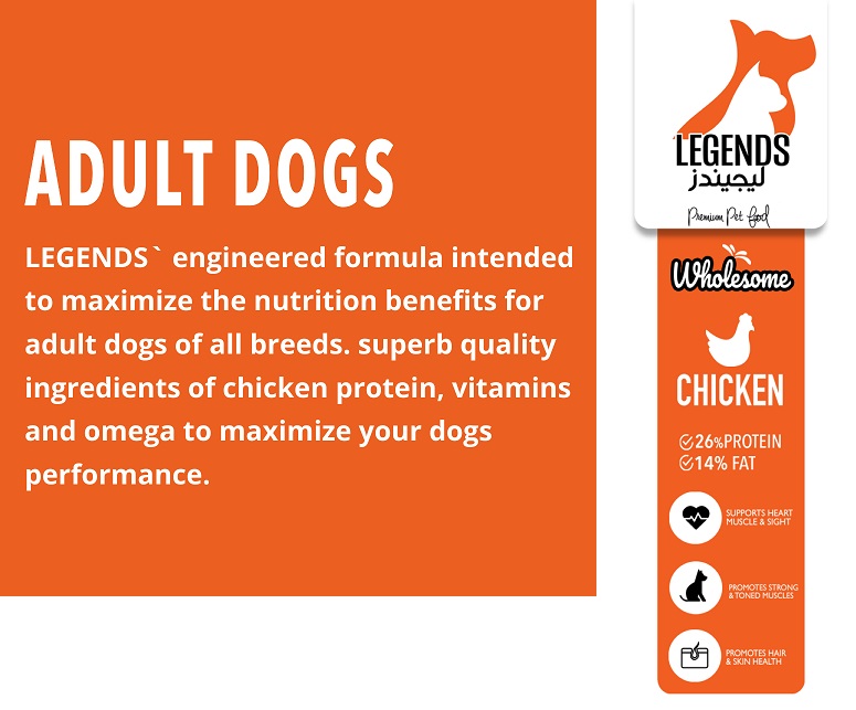 Formulated for the health and well-being of dogs, LEGENDS® Wholesome dry food for adult dogs with 26% protein & 14% fat is made of high-quality natural ingredients and enhanced with vitamins and minerals to form a complete dry food that maximizes the nutritional benefits for your pet. It contains the ingredients you’ll love feeding as much as they’ll love eating.