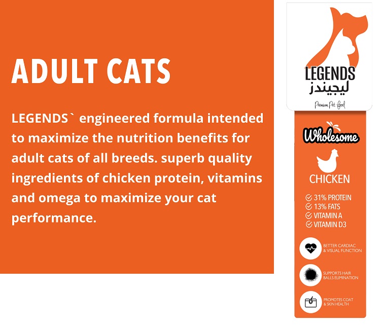 Banner: ADULT CAT FOOD THAT NOURISHES Choosing the right adult cat food is an important step on your cat’s path to lifelong health. LEGENDS® WHOLESOME for adult cats’ formula offers great taste, texture, and outstanding nutrition that your cats will love and enjoy without compromise. |