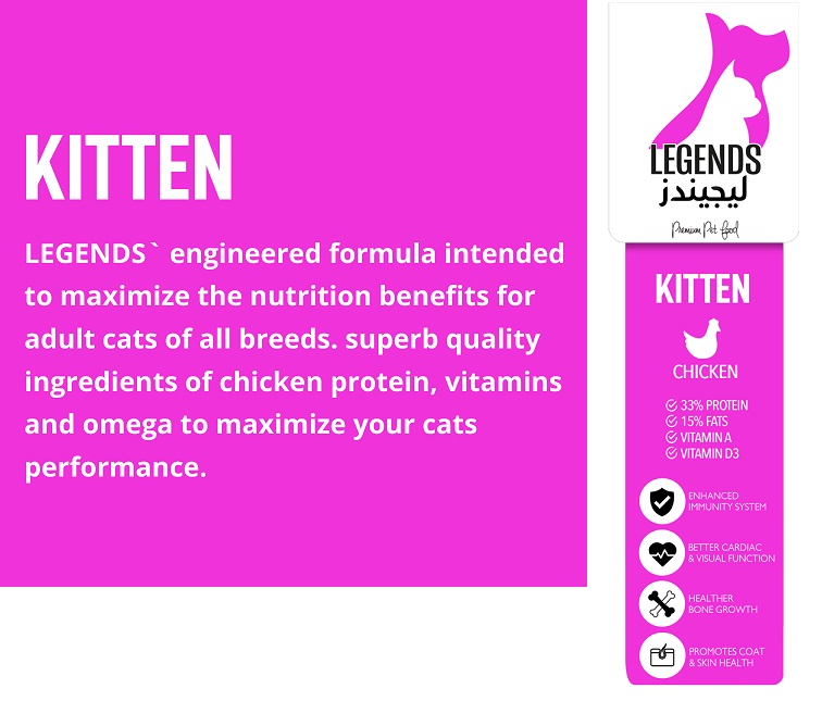 Your kitten’s first year is a time of rapid growth and development and it is our duty to support it on its journey to healthy adulthood. LEGENDS® Kitten dry food formula with 33% protein & 15% fat is formulated for the health and well-being of your kitten. It is made of high-quality natural ingredients and enhanced with vitamins and minerals to offer complete and balanced nutrition benefits for your kitten. It contains the ingredients you’ll love feeding as much as they’ll love eating.