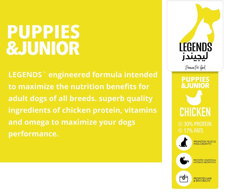 PUPPIES & JUNIOR FOOD THAT HAS EVERYTHING YOUR PUPPY NEEDS TO GROW UP HEALTHY Puppies have specific nutritional needs during their first 1-2 years of life. Normal food may not have all the nutrients puppies need for healthy growth and development. By choosing LEGENDS® FOR PUPPIES & JUNIOR DOGS you’re giving your puppy the complete nutrition he needs to become a healthy adult dog |
