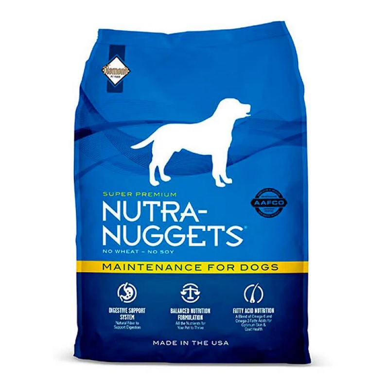 Nutra Nuggets Maintenance 15KG – Complete Premium Adult Dog Food Nutra Nuggets Maintenance is a premium-quality dry dog food designed to meet the nutritional needs of normally active adult dogs. It offers a perfectly balanced formula that supports healthy muscles, strong bones, shiny coats, and overall well-being. This recipe combines high-quality protein from chicken and rice with essential vitamins and minerals to ensure complete daily nutrition. Formulated for adult dogs with moderate activity levels, Nutra Nuggets Maintenance provides optimal energy without promoting weight gain. The balanced protein-to-fat ratio (24% protein and 14% fat) helps maintain lean muscle mass while supporting ideal body condition. Omega-6 and Omega-3 fatty acids promote healthy skin and a glossy coat, while antioxidants strengthen the immune system for long-term vitality. Each kibble is made with premium chicken meal for a rich, meaty taste that dogs love, along with easily digestible grains for smooth digestion. The formula does not contain artificial colors, flavors, or preservatives — ensuring clean, high-quality nutrition in every bowl.